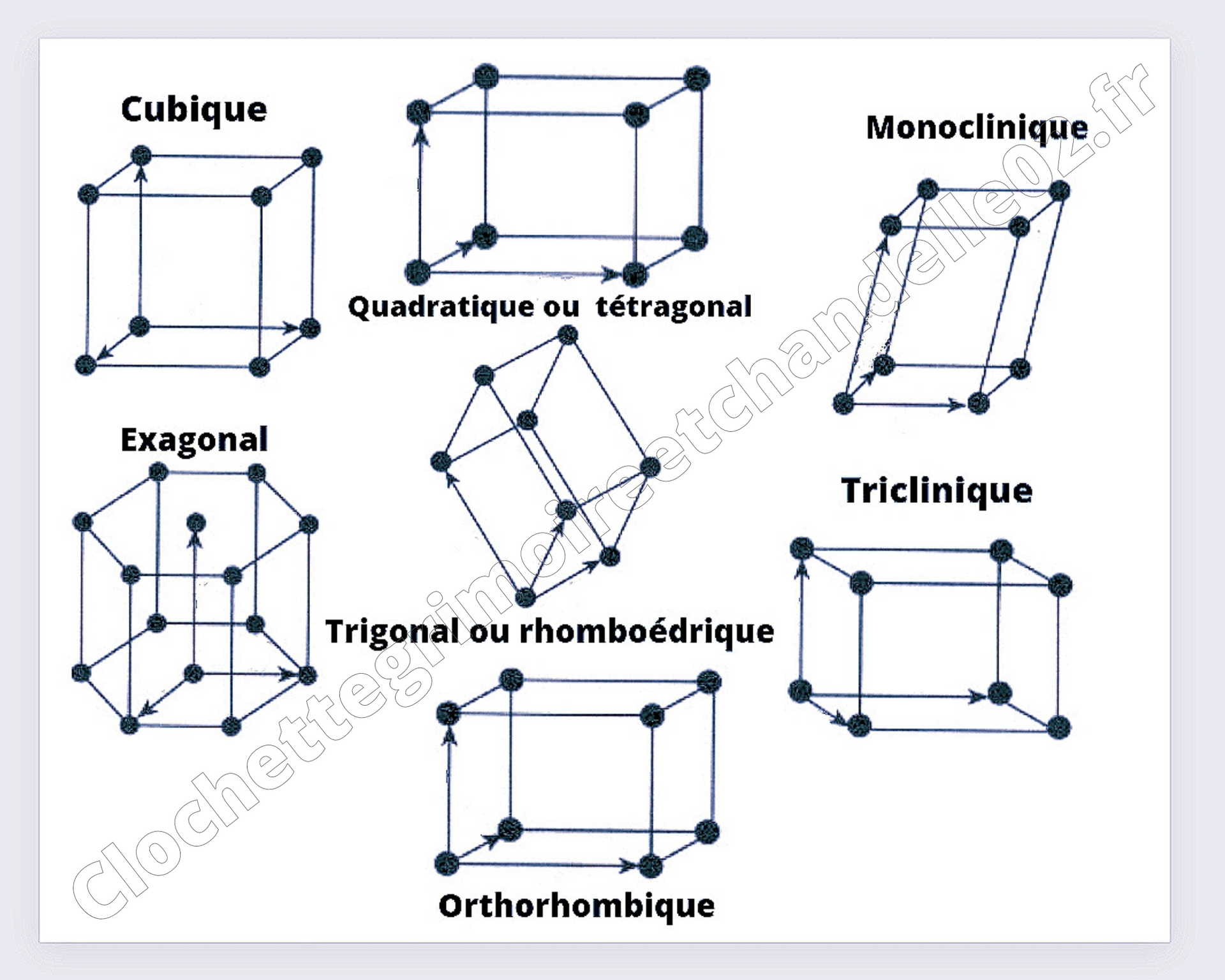 Les sept systèmes cristallins en minéralogie sont les suivants :